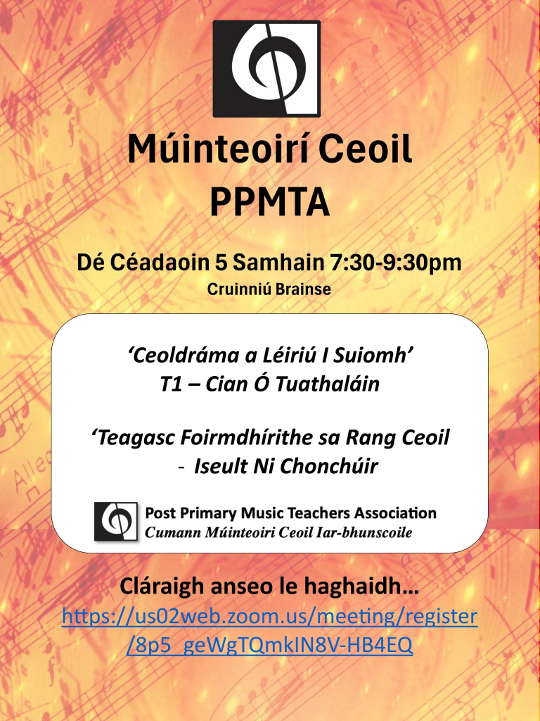 Cláraigh anois d o n cheardlann iontach seo do mhúinteoirí ceoil na nGaelcholáistí a bheidh ar siúl Dé Céadaoin 5 Samhain 7:30-9:30 i.n. ar líne. Bígí linn!